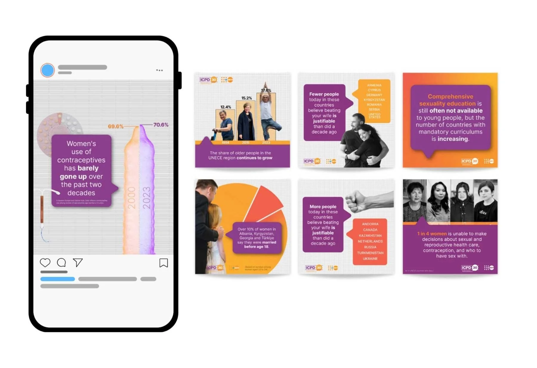 I managed the entire communications campaign for UNFPA and UNECE, delivering a cohesive brand identity and a full suite of materials for the conference. My responsibilities included creating two interactive websites—one to showcase key report findings and another serving as the official conference hub with speaker information and the event schedule. I also developed and executed a comprehensive social media campaign with over 30 posts, and designed all event materials, including stage backdrops and banners. The scope of my work also included providing art direction for the 200+ page printed report, ensuring a consistent and professional visual identity across all platforms. This project demonstrates my ability to manage complex, multi-faceted campaigns from a strategic and creative perspective.